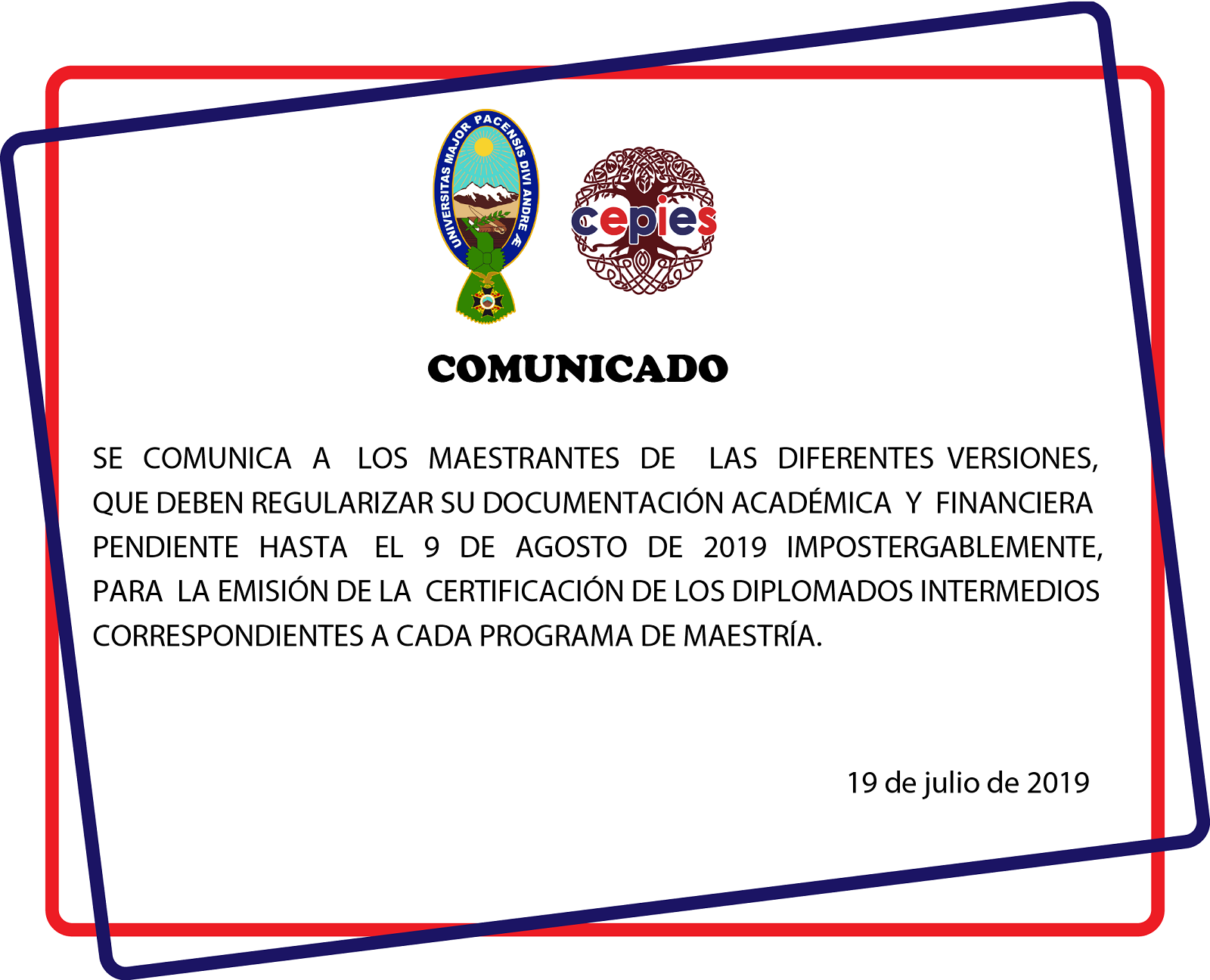Se comunica a los maestrantes de las diferentes versiones que deben regularizar su documentacion academica y financiera hasta el 9 de agosto para la emisión de los certificados intermedios correspondientes a cada programa de maestria.