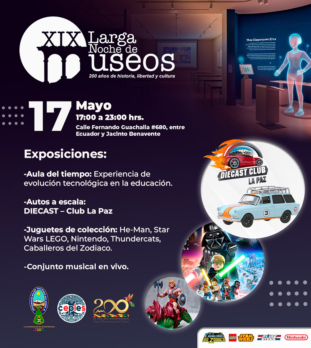 El pasado sábado 17 del presente mes, el Centro Psicopedagógico y de Investigación en Educación Superior (CEPIES) de la Universidad Mayor de San Andrés, fue sede de la “XIX Larga Noche de Museos”, un evento cultural que tuvo lugar en los predios de la histórica Casa Guachalla. La jornada fue un rotundo éxito, con la asistencia de más de 300 visitantes, quienes disfrutaron de una experiencia enriquecedora y educativa.