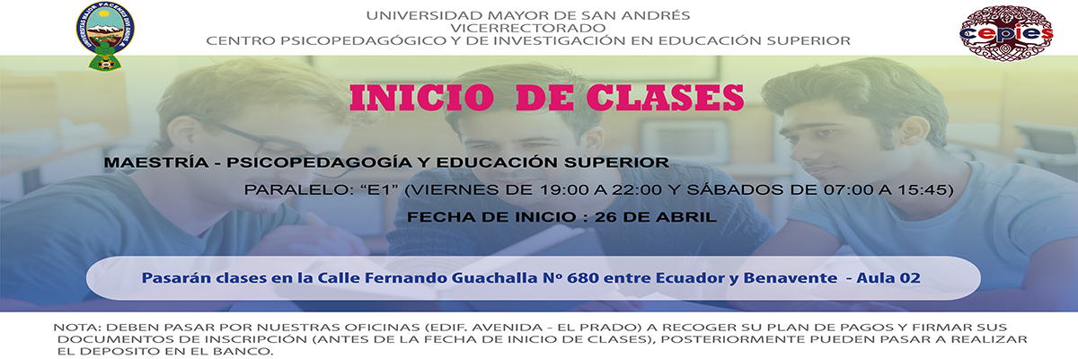 Estimados maestrantes se informa que la maestria paralelo E1 dara inicio en fecha 26 de abril.